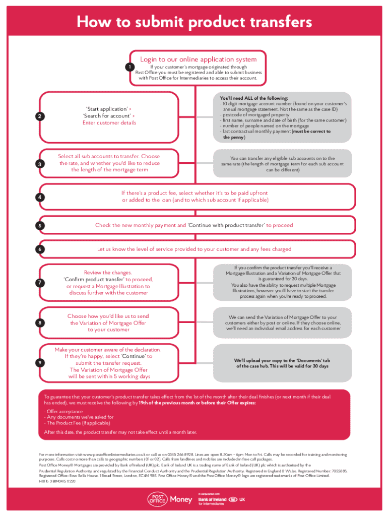 How to submit product transfers Login to our online application system 1If your customers mortgage originated through Post Office you must be registered and able to submit business with Post Office