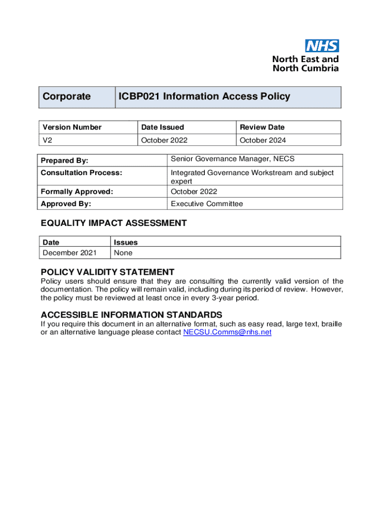 CorporateICBP021 Information Access PolicyVersion Numerate IssuedReview DateV2October 2022October 2024Prepared By:Senior Governance Manager, Reconsultation Process: