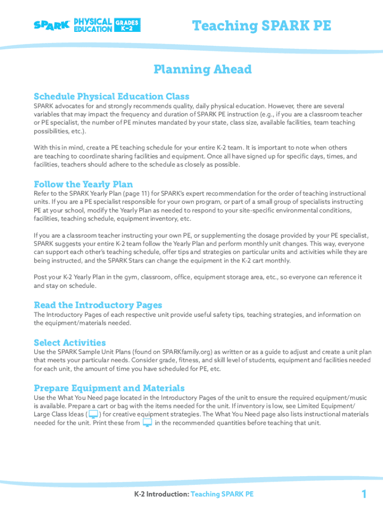 Teaching SPARK PE Planning Ahead Schedule Physical Education ClassSPARK advocates for and strongly recommends quality, daily physical education. However, there are several variables that may impact