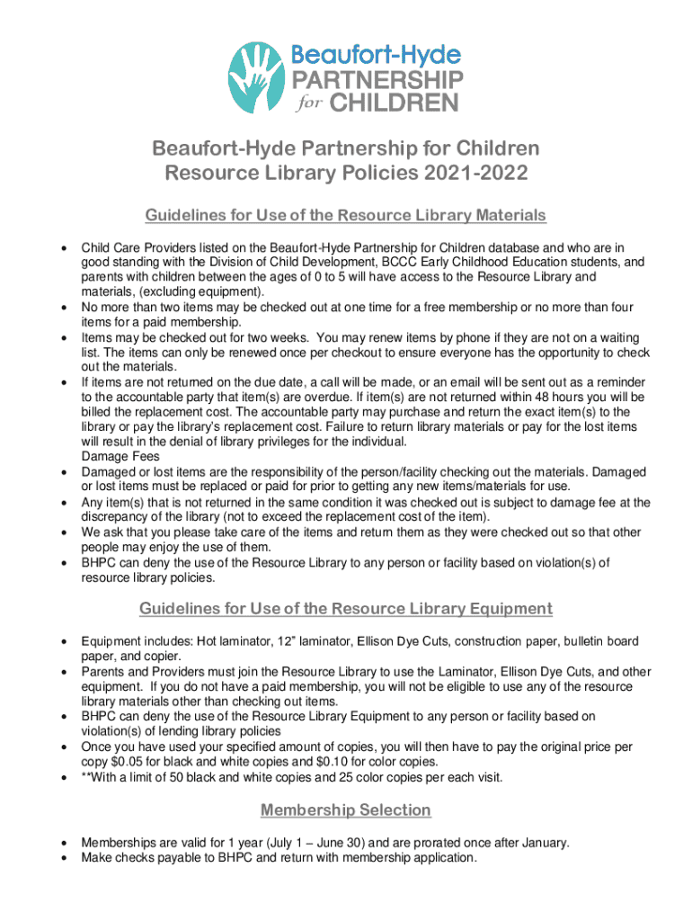 Beaufort Hyde Partnership for Children Resource Library Policies 20212022 Guidelines for Use of the Resource Library Materials Child Care Providers listed on the Beaufort Hyde Partnership for Children