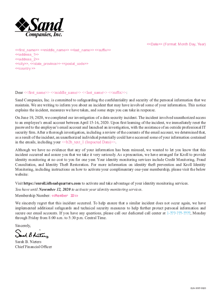 Date (Format: Month Day, Year) first_name middle_name last_name suffix address_1 address_2 city, state_province postal_code country Dear first_name middle_name last_name suffix: Sand Companies, Inc.