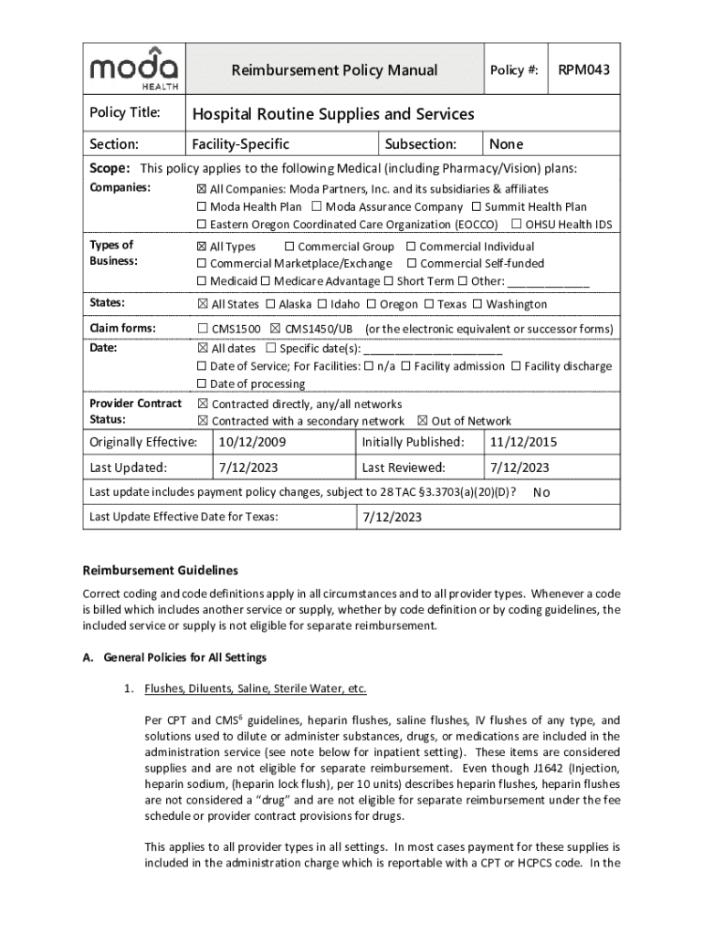 Reimbursement Policy Manual Policy Title:Hospital Routine Supplies and ServicesSection:FacilitySpecificSubsection:Policy #:RPM043NoneScope: This policy applies to the following Medical (including