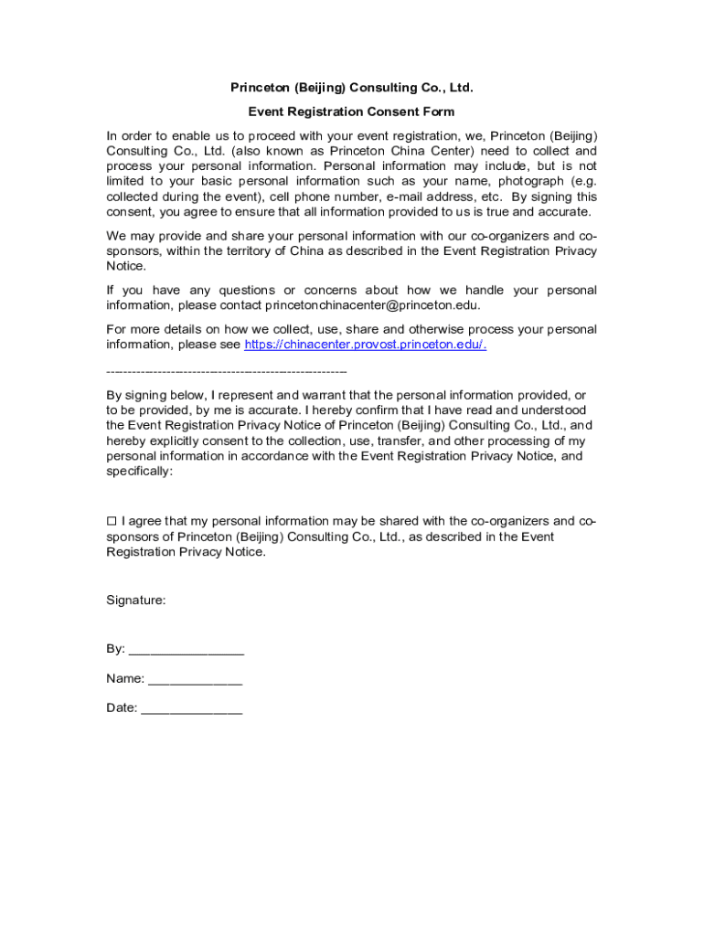 Princeton (Beijing) Consulting Co., Ltd. Event Registration Consent Form In order to enable us to proceed with your event registration, we, Princeton (Beijing) Consulting Co., Ltd. (also known as