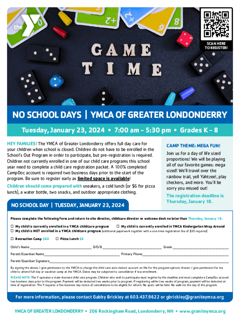 SCAN HERE TO REGISTER!NO SCHOOL DAYS | YMCA OF GREATER LONDONDERRY Tuesday, January 23, 2024 7:00 am 5:30 pm Grades K 8 HEY FAMILIES! The YMCA of Greater Londonderry offers full day care for your