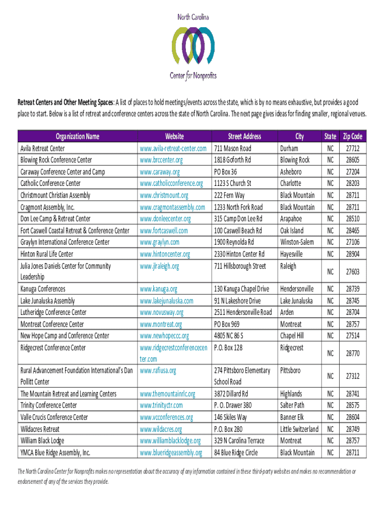Retreat Centers and Other Meeting Spaces: A list of places to hold meetings/events across the state, which is by no means exhaustive, but provides a good place to start. Below is a list of retreat