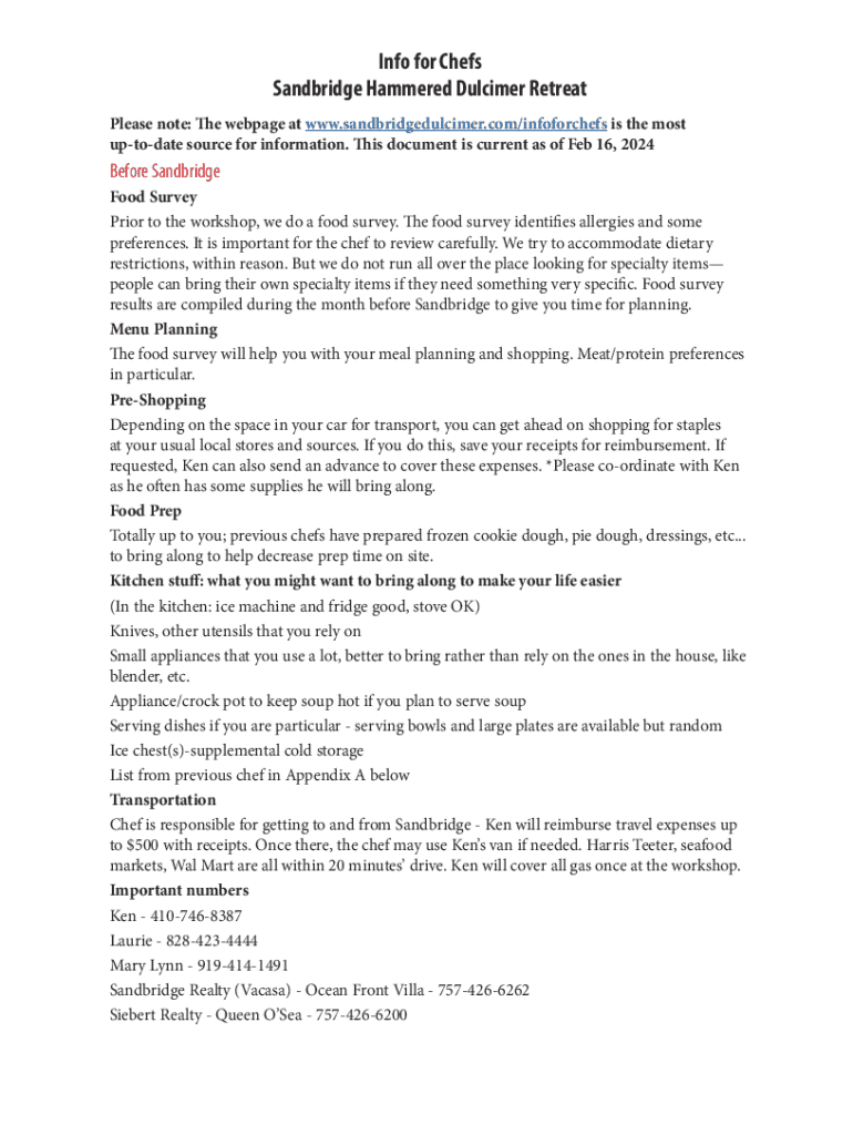 Info for Chefs Sandbridge Hammered Dulcimer Retreat Please note: The webpage at www.sandbridgedulcimer.com/infoforchefs is the most uptodate source for information. This document is current as of