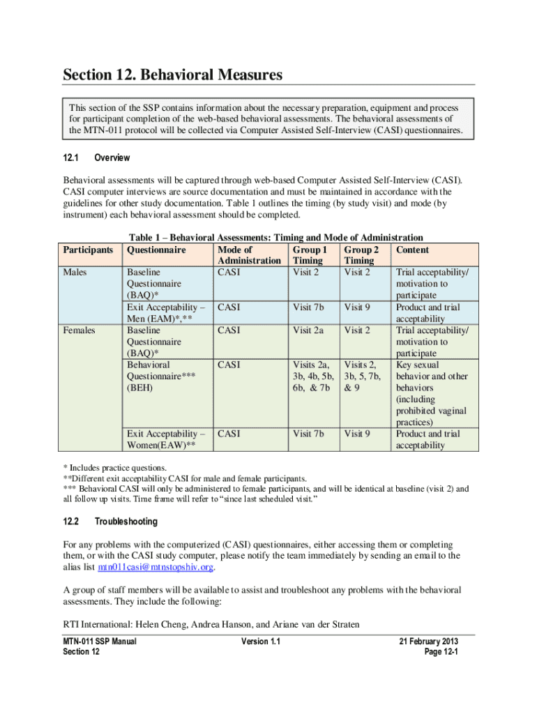 Section 12. Behavioral Measures This section of the SSP contains information about the necessary preparation, equipment and process for participant completion of the webbased behavioral assessments.