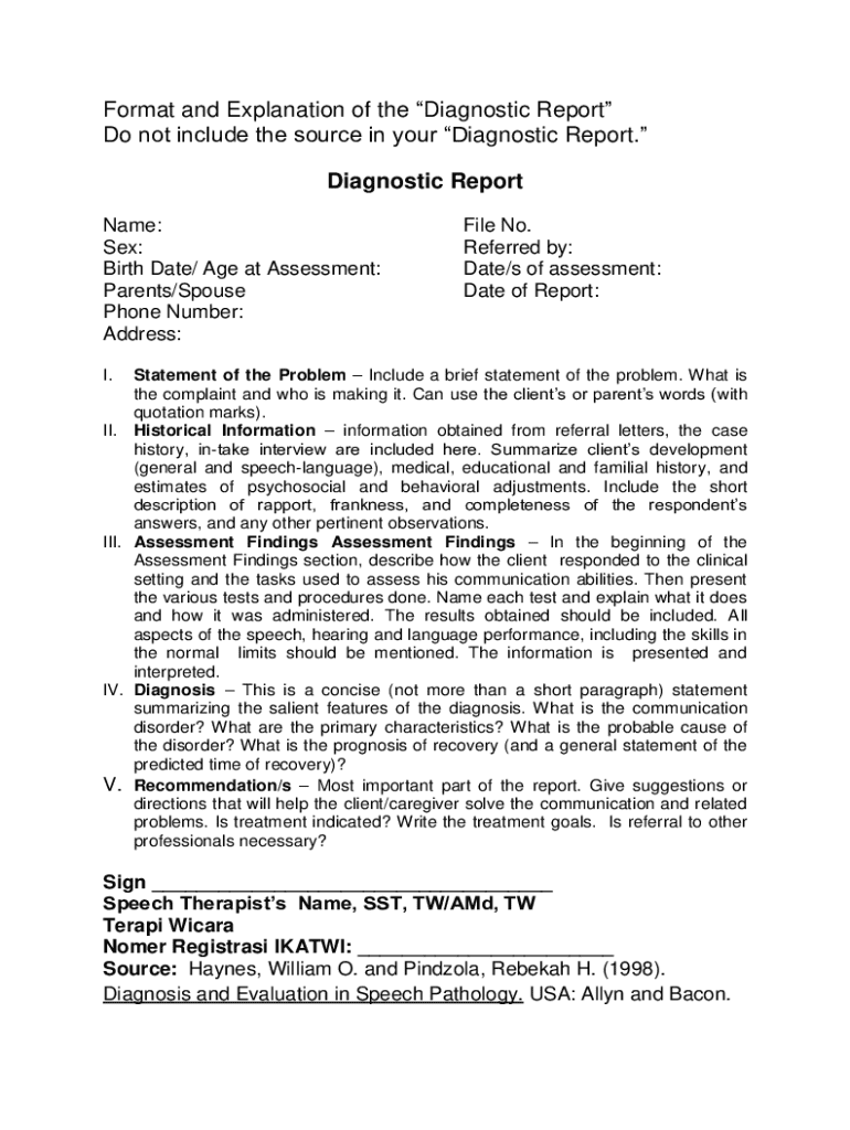 Format and Explanation of the Diagnostic Report Do not include the source in your Diagnostic Report. Diagnostic Report Name: Sex: Birth Date/ Age at Assessment: Parents/Spouse Phone Number: Address: