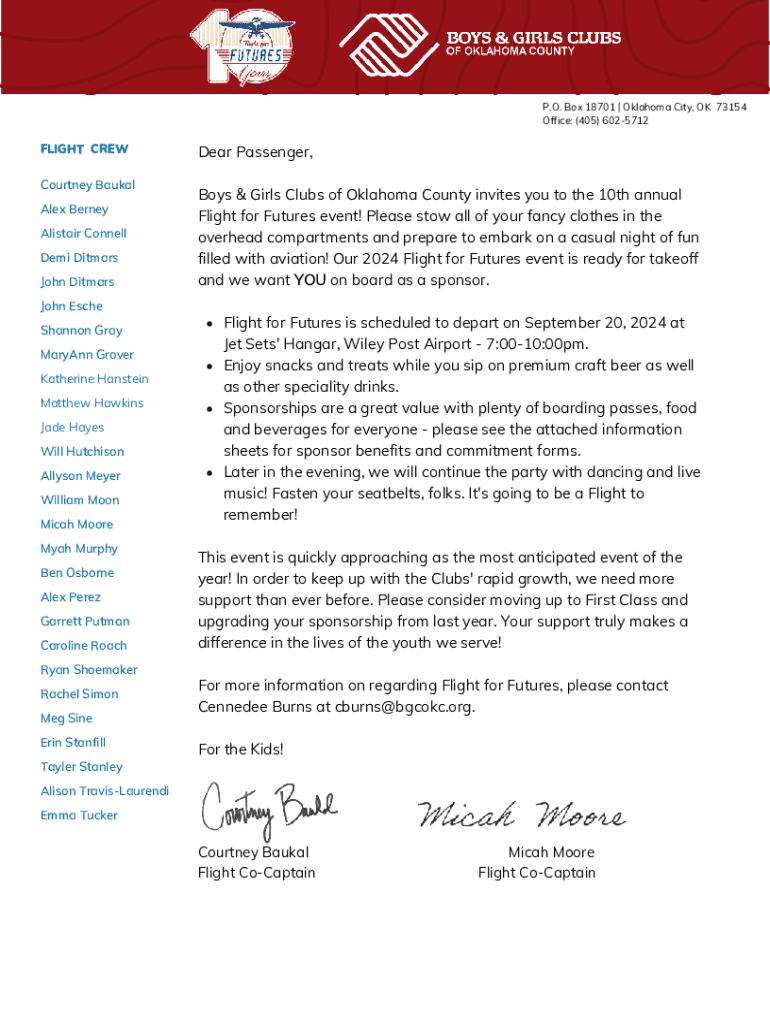P.O. Box 18701 | Oklahoma City, OK 73154 Office: (405) 6025712FLIGHT CREW Courtney Baikal Alex Barney Alistair Connell Demi Ditmars John Eschew Shannon Gray Maryann Grover Katherine Han stein Matthew