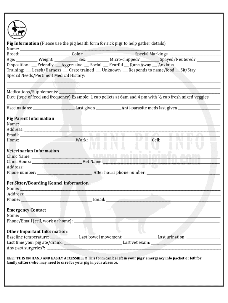 PigInformation(Pleaseusethepighealthformforsickpigstohelpgatherdetails) Name:___ Breed:___Color:___SpecialMarkings:___ Age:___Weight:___Sex:___Microchipped?___Spayed/Neutered?___ Disposition:___Friendly___Aggressive___Social___Fearful___Runs