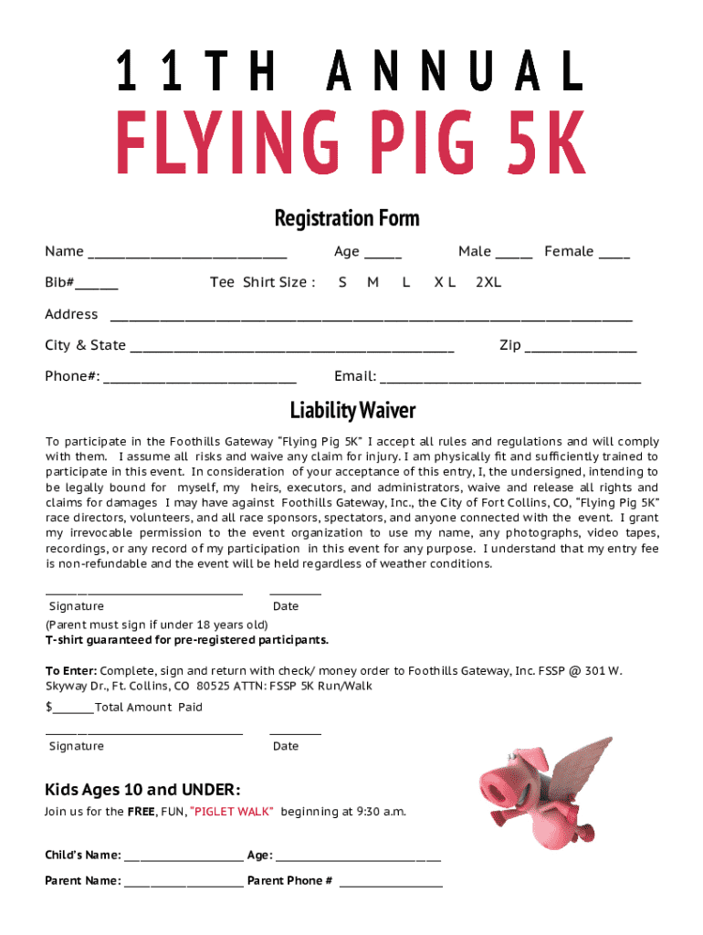 Registration Form Name ___Bib#___Age ___Tee Shirt Size :SM Male ___ Female ___LXL2XLAddress ___ City & State ___ Phone#: ___Zip ___Email: ___Liability Waiver To participate in the Foothills Gateway
