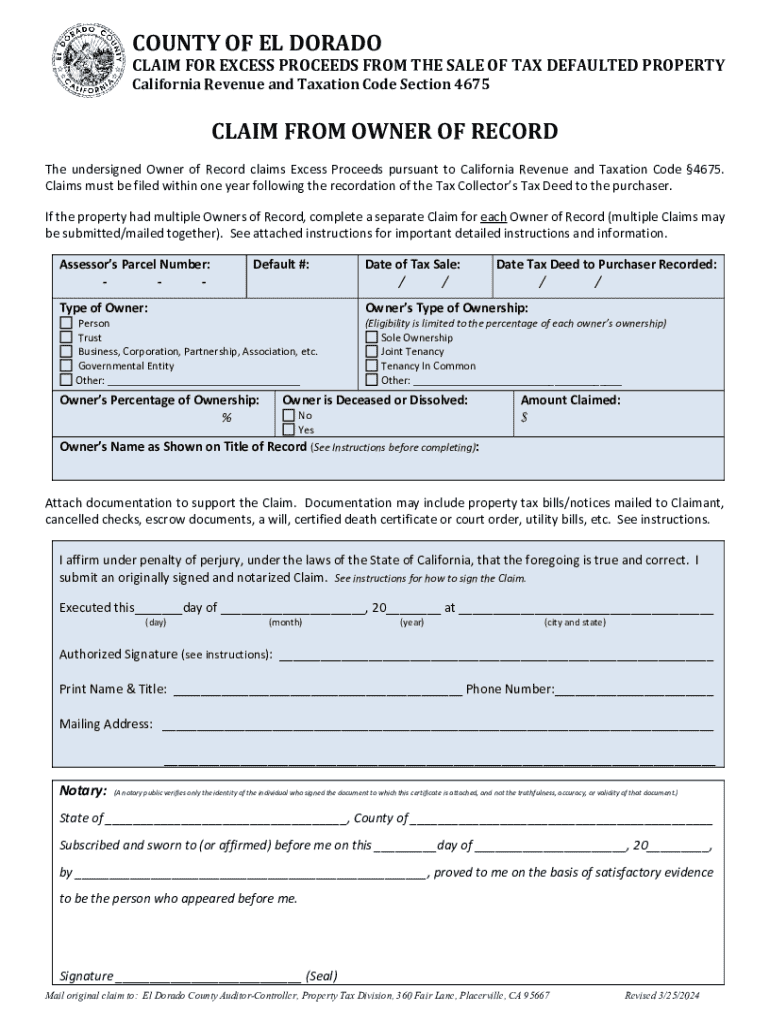 COUNTY OF EL DORADOCLAIM FOR EXCESS PROCEEDS FROM THE SALE OF TAX DEFAULTED PROPERTY California Revenue and Taxation Code Section 4675CLAIM FROM OWNER OF RECORD The undersigned Owner of Record claims