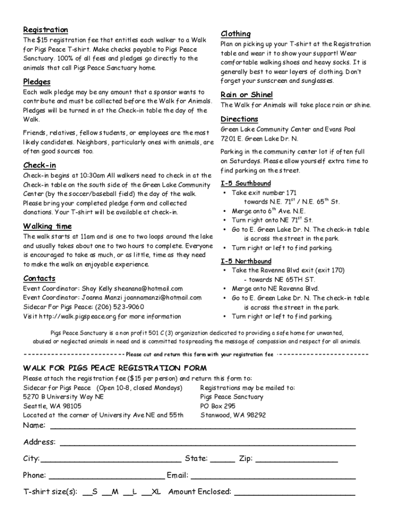 Registration The $15 registration fee that entitles each walker to a Walk for Pigs Peace Tshirt. Make checks payable to Pigs Peace Sanctuary. 100% of all fees and pledges go directly to the animals