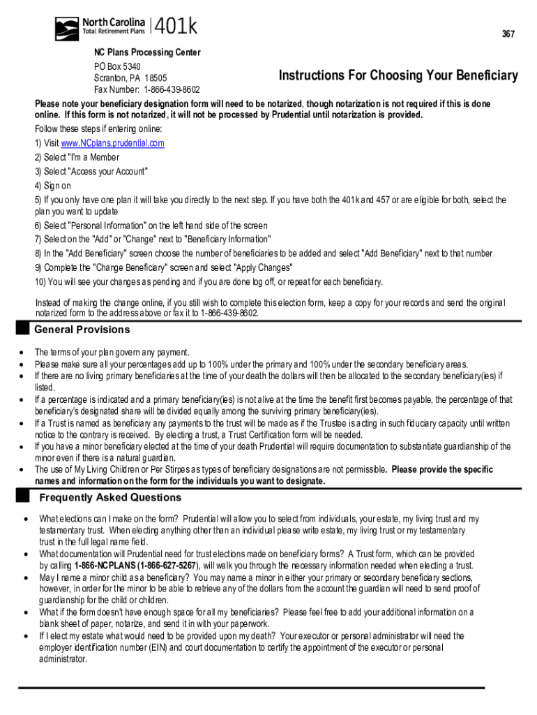 367 NC Plans Processing Center PO Box 5340 Instructions For Choosing Your Beneficiary Scranton, PA 18505 Fax Number: 18664398602 Please note your beneficiary designation form will need to be notarized,