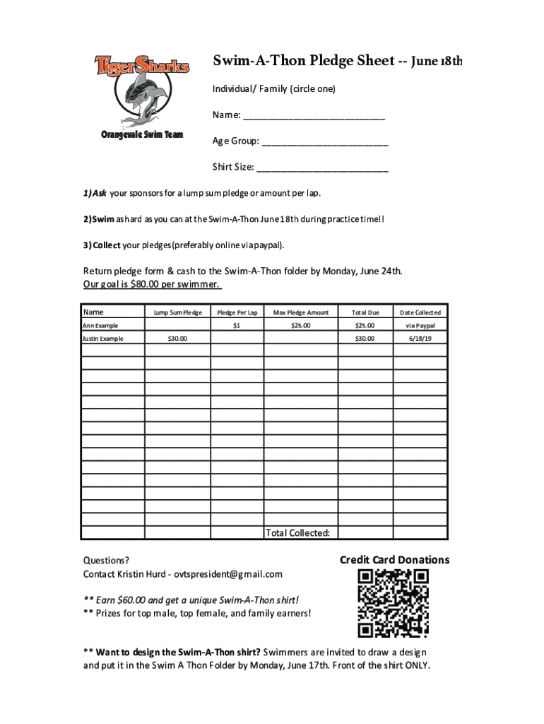 The swim-a-thon pledge sheet must report donor names, donation amounts, and contact information.