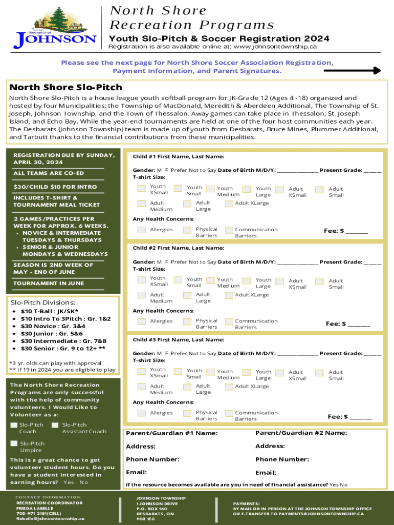 North Shore Recreation Programs Youth SloPitch & Soccer Registration 2024 Registration is also available online at: www.johnsontownship.caPlease see the next page for North Shore Soccer Association