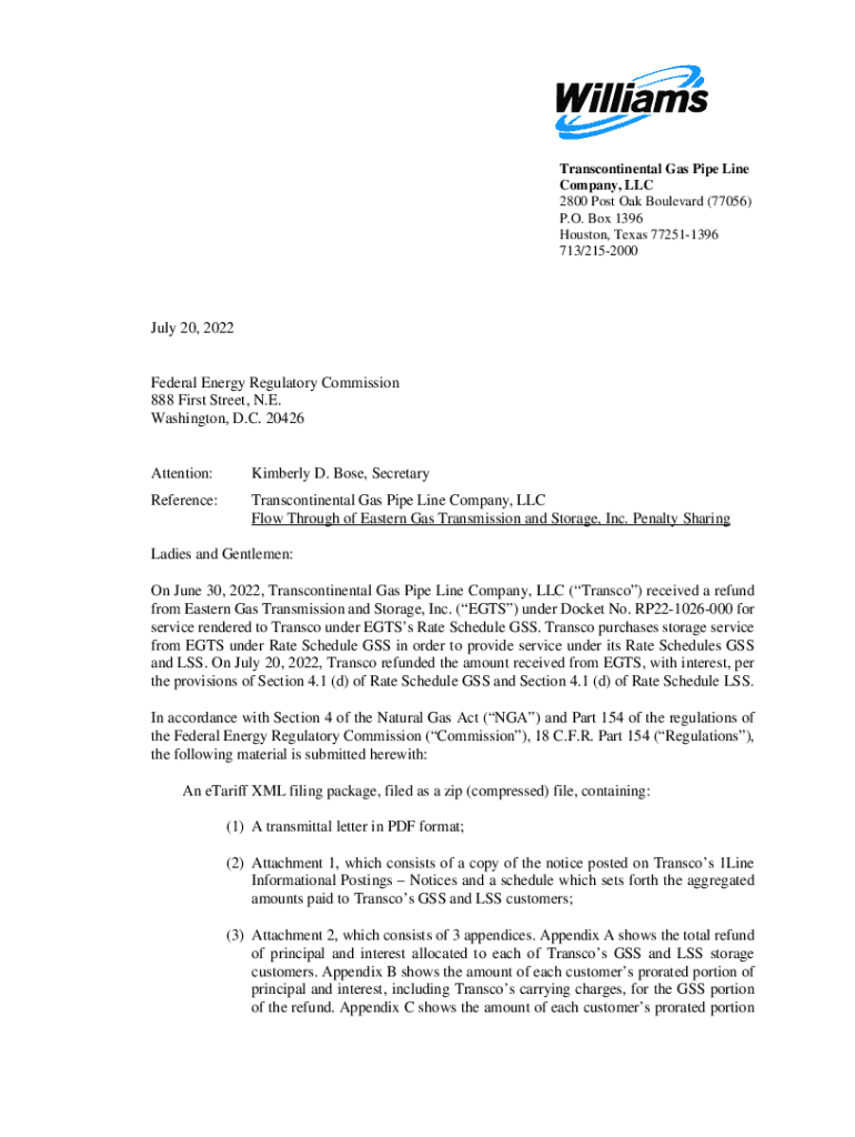 Transcontinental Gas Pipe Line Company, LLC 2800 Post Oak Boulevard (77056) P.O. Box 1396 Houston, Texas 772511396 713/2152000July 20, 2022Federal Energy Regulatory Commission 888 First Street, N.E.