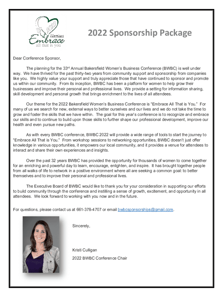 2022 Sponsorship Package Dear Conference Sponsor, The planning for the 33rd Annual Bakersfield Womens Business Conference (BWBC) is well under way. We have thrived for the past thirtytwo years from