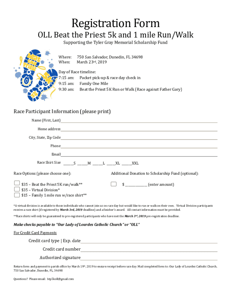 Registration FormOLL Beat the Priest 5k and 1 mile Run/Walk Supporting the Tyler Gray Memorial Scholarship Fund Where: When:750 San Salvador, Dunedin, FL 34698 March 23rd, 2019Day of Race timeline: