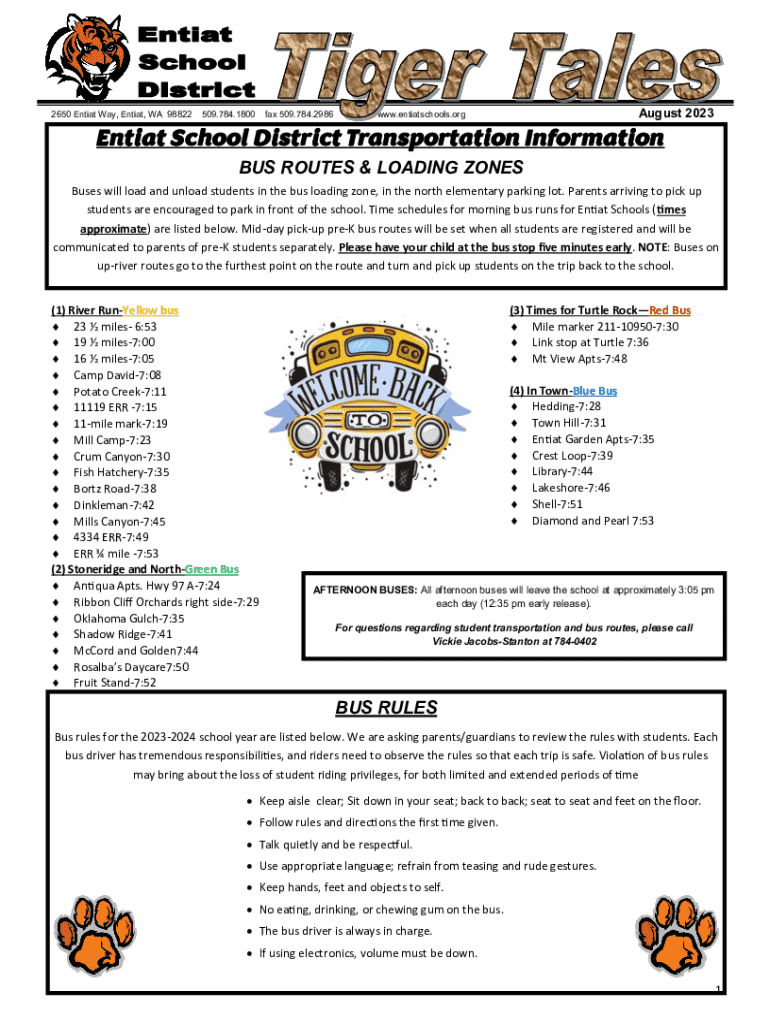 2650 Entiat Way, Entiat, WA 98822509.784.1800fax 509.784.2986August 2023www.entiatschools.orgEntiat School District Transportation Information BUS ROUTES & LOADING ZONES Buses will load and unload