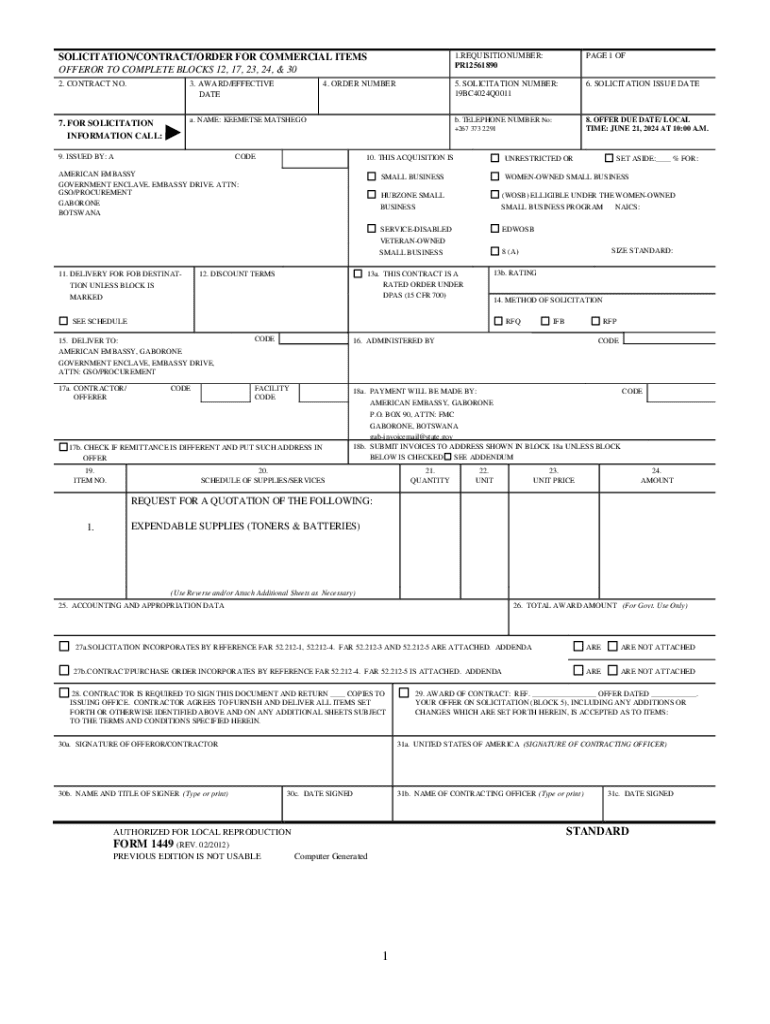 SOLICITATION/CONTRACT/ORDER FOR COMMERCIAL ITEMS OFFEROR TO COMPLETE BLOCKS 12, 17, 23, 24, & 301.REQUISITIONUMBER: PR12561890PAGE 1 OF2. CONTRACT NO.3. AWARD/EFFECTIVE DATE5. SOLICITATION NUMBER: