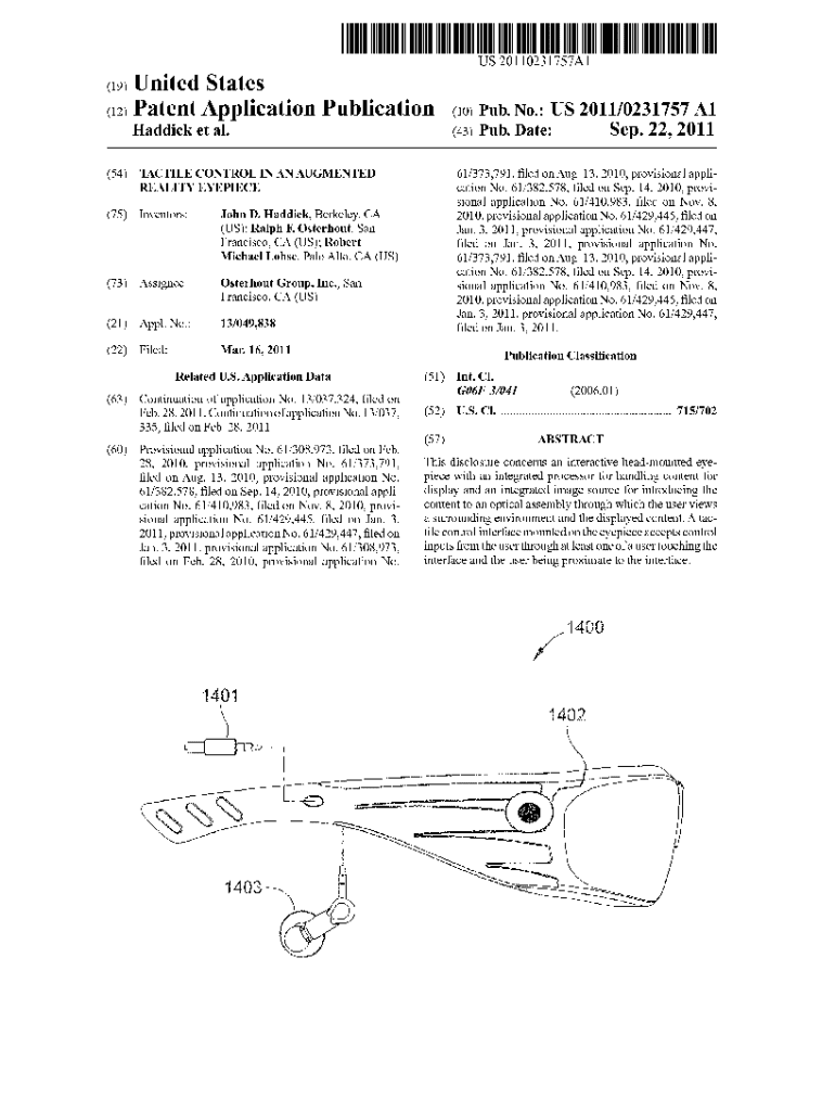 US 20110231757A1(19) United States(12) Patent Application Publication (10) Pub. No.: US 2011/0231757 A1 Haddick et al.(43) Pub. Date:(54) TACTILE CONTROL IN AN AUGMENTED REALITY EYEPIECE (75) Inventors:John