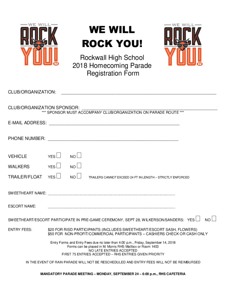 WE WILL ROCK YOU! Rockwell High School 2018 Homecoming Parade Registration Form CLUB/ORGANIZATION:___CLUB/ORGANIZATION SPONSOR: ___ *** SPONSOR MUST ACCOMPANY CLUB/ORGANIZATION ON PARADE ROUTE ***EMAIL