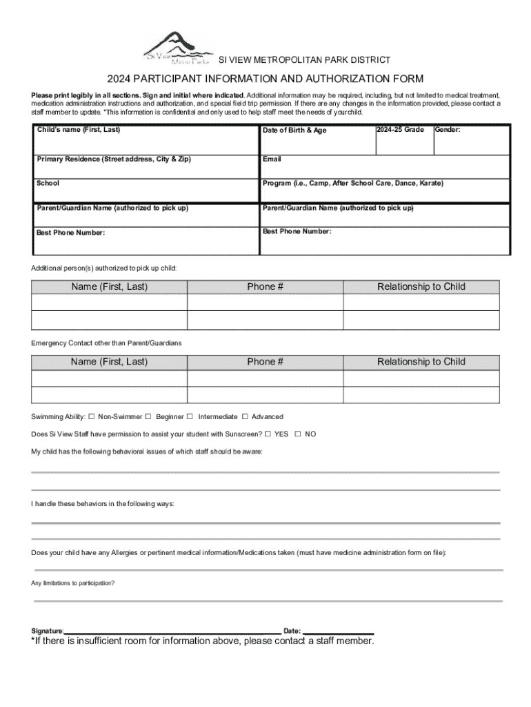 SI VIEW METROPOLITAN PARK DISTRICT2024 PARTICIPANT INFORMATION AND AUTHORIZATION FORM Please print legibly in all sections. Sign and initial where indicated. Additional information may be required,