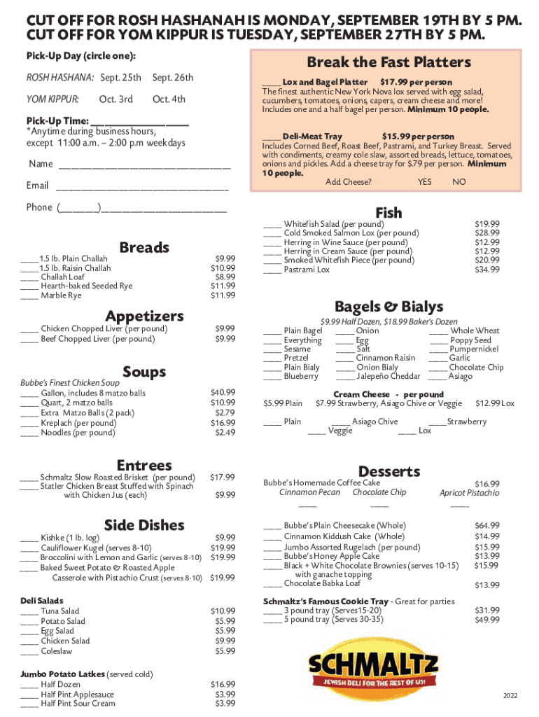 CUT OFF FOR ROSH HASHANAH IS MONDAY, SEPTEMBER 19TH BY 5 PM. CUT OFF FOR YOM KIPPUR IS TUESDAY, SEPTEMBER 27TH BY 5 PM. PickUp Day (circle one):Break the Fast PlattersROSH HASHANA: Sept. 25thSept.