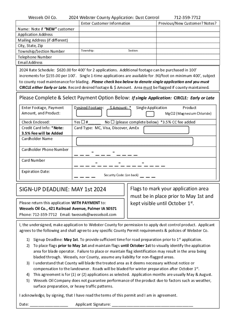 Vessels Oil Co.2024 Webster County Application: Dust Controllable: Note if NEW customer Application Address Mailing Address (if different) City, State, Zip Township/Section Number Telephone Number