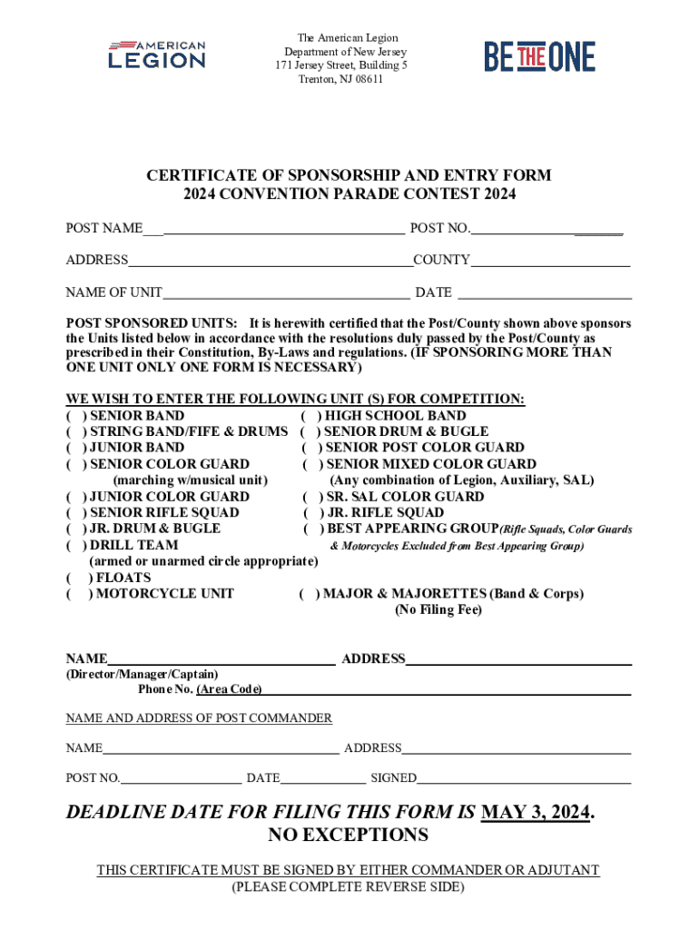The American Legion Department of New Jersey 171 Jersey Street, Building 5 Trenton, NJ 08611CERTIFICATE OF SPONSORSHIP AND ENTRY FORM 2024 CONVENTION PARADE CONTEST 2024 POST NAME___POST NO.ADDRESSCOUNTYNAME