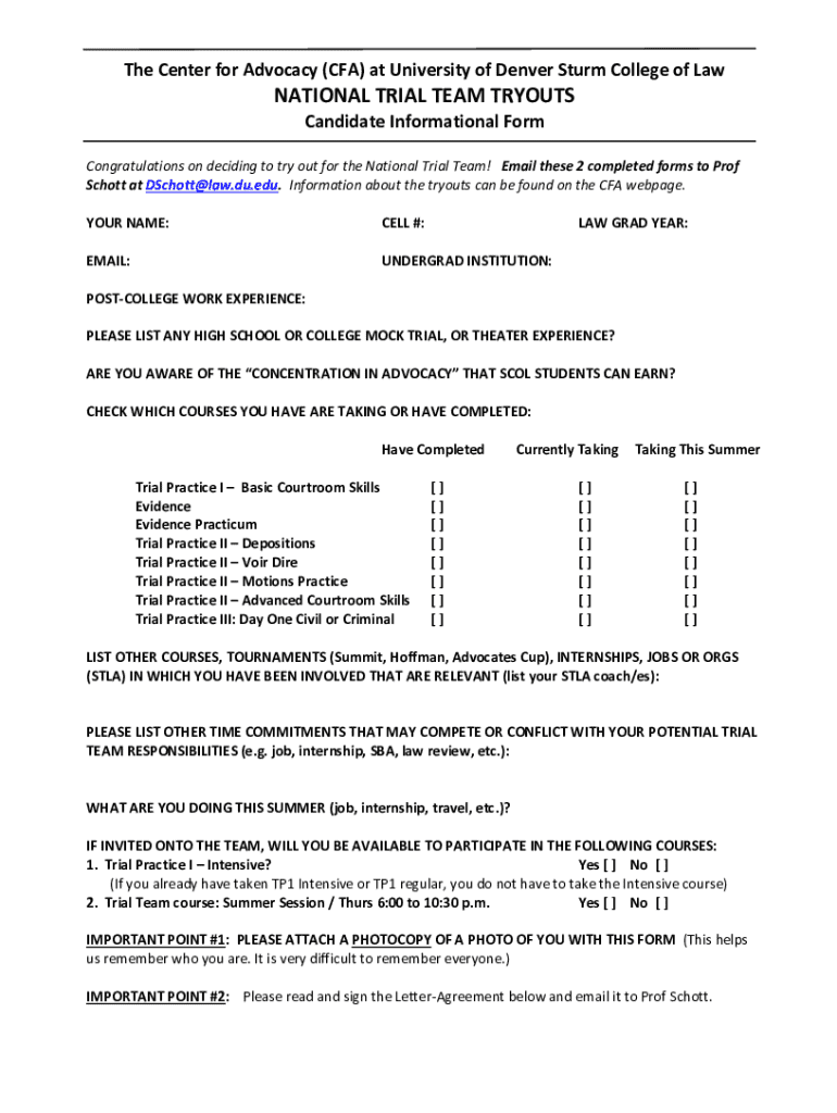 The Center for Advocacy (CFA) at University of Denver Storm College of Lactational TRIAL TEAM TRYOUTS Candidate Informational Form Congratulations on deciding to try out for the National Trial Team!