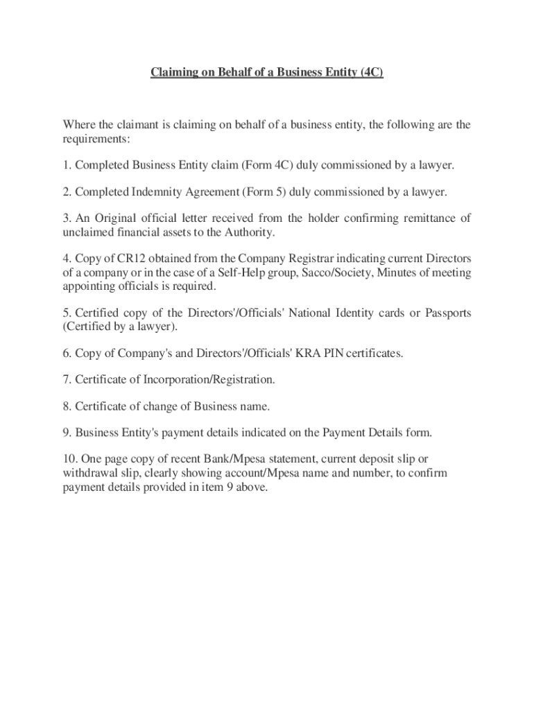 Claiming on Behalf of a Business Entity (4C)Where the claimant is claiming on behalf of a business entity, the following are the requirements: 1. Completed Business Entity claim (Form 4C) duly commissioned