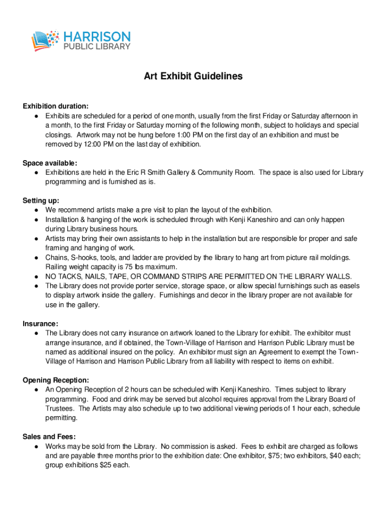 Art Exhibit Guidelines Exhibition duration: Exhibits are scheduled for a period of one month, usually from the first Friday or Saturday afternoon in a month, to the first Friday or Saturday morning
