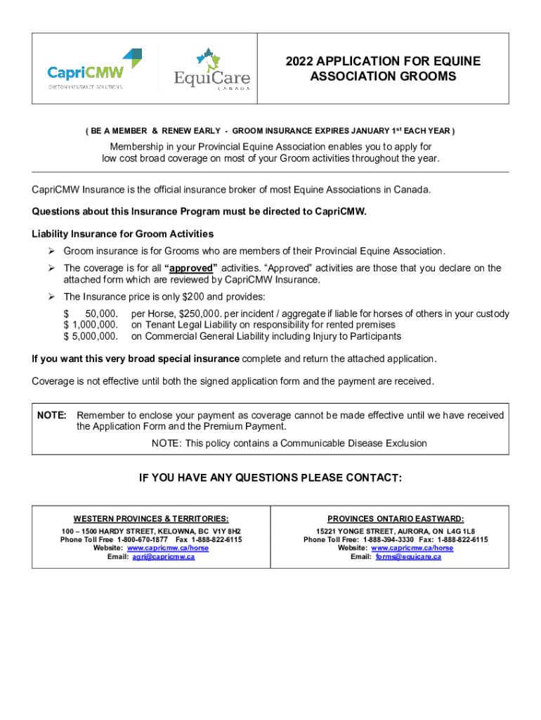 2022 APPLICATION FOR EQUINE ASSOCIATION GROOMS(BE A MEMBER & RENEW EARLY GROOM INSURANCE EXPIRES JANUARY 1st EACH YEAR)Membership in your Provincial Equine Association enables you to apply for low