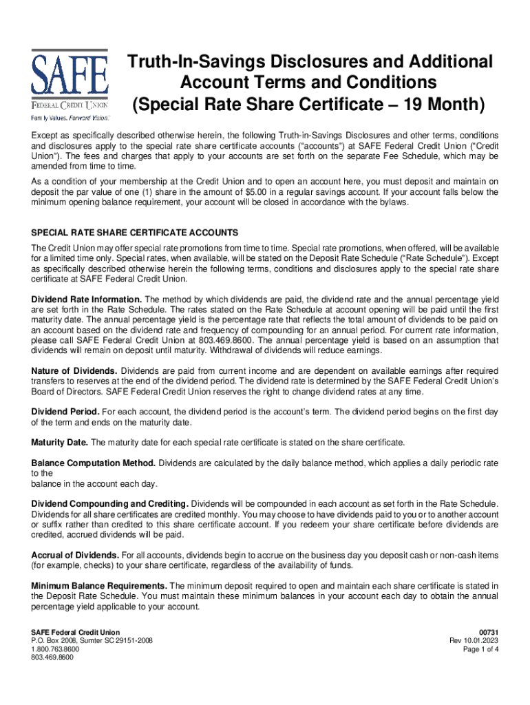 TruthInSavings Disclosures and Additional Account Terms and Conditions (Special Rate Share Certificate 19 Month) Except as specifically described otherwise herein, the following TruthinSavings Disclosures