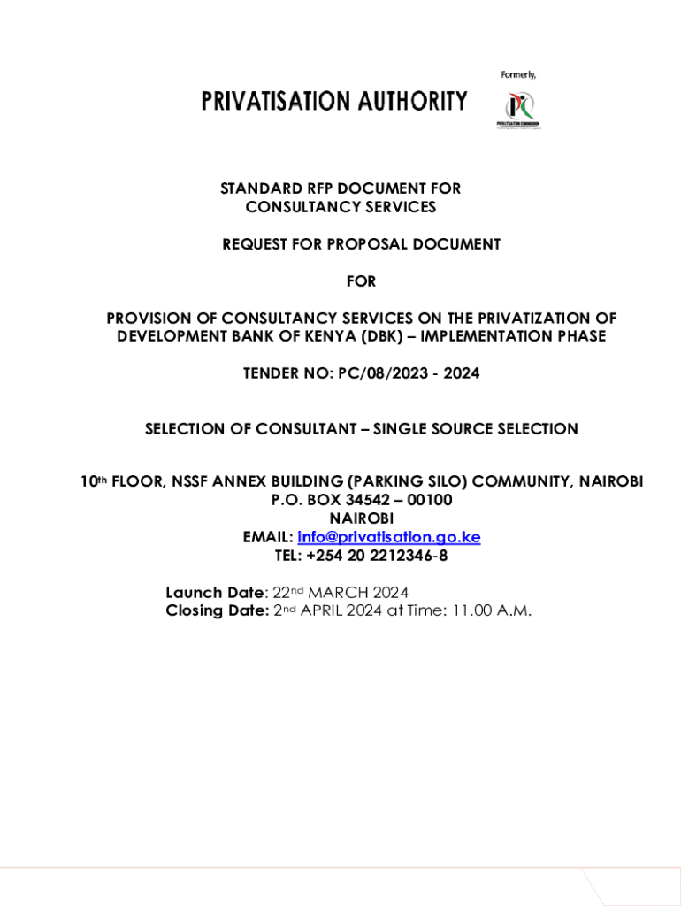 STANDARD RFP DOCUMENT FOR CONSULTANCY SERVICES REQUEST FOR PROPOSAL DOCUMENT FOR PROVISION OF CONSULTANCY SERVICES ON THE PRIVATIZATION OF DEVELOPMENT BANK OF KENYA (dB) IMPLEMENTATION PHASE TENDER
