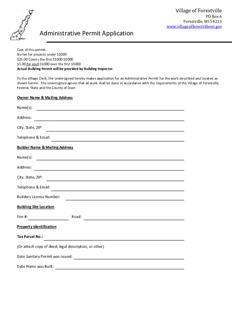 Village of ForestvilleAdministrative Permit ApplicationPO Box 6 Forestville, WI 54213 www.villageofforestvillewi.govCost of this permit: No fee for projects under $1000 $25.00 Covers the first $1000$5000