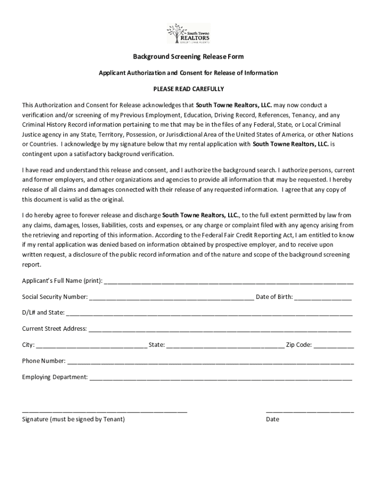 Background Screening Release Form Applicant Authorization and Consent for Release of Information PLEASE READ CAREFULLY This Authorization and Consent for Release acknowledges that South Town Realtors,