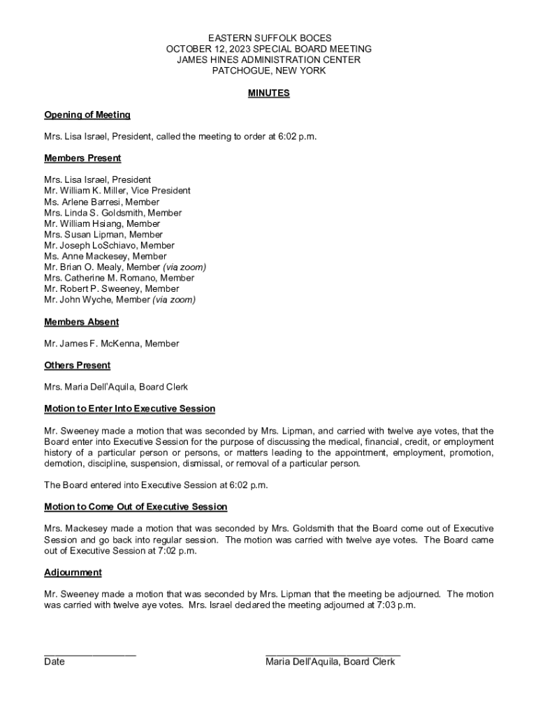 EASTERN SUFFOLK BONES OCTOBER 12, 2023, SPECIAL BOARD MEETING JAMES HINES ADMINISTRATION CENTER PATHOGEN, NEW YORK MINUTES Opening of Meeting Mrs. Lisa Israel, President, called the meeting to order