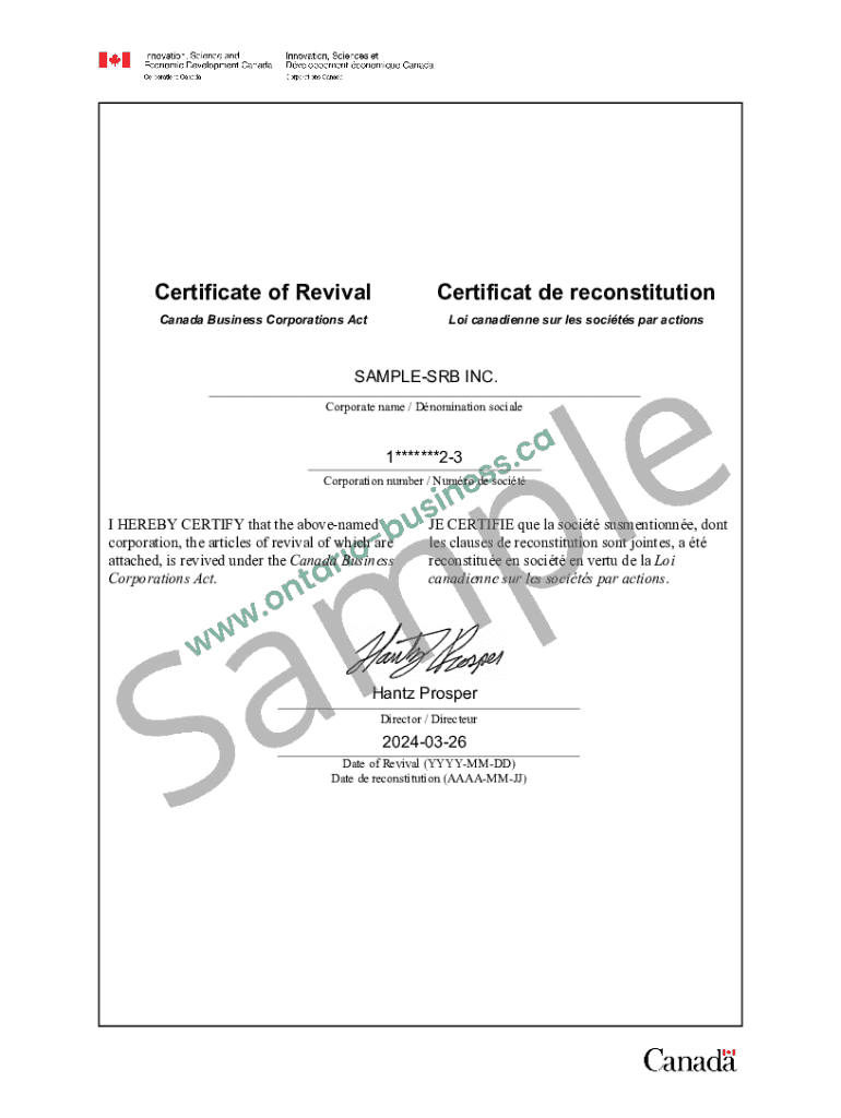 Certificate of RevivalCertificat de reconstitution Canada Business Corporations Action Canadian SUR LES soc its par actionsSAMPLESRB INC.