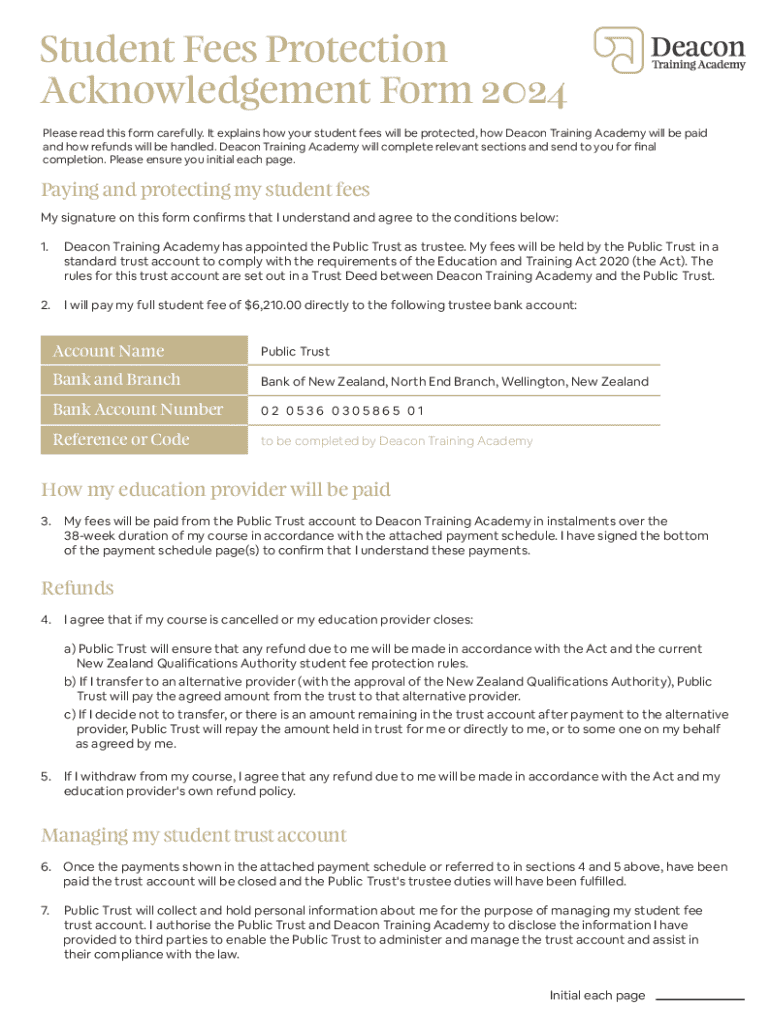 Student Fees Protection Acknowledgement Form 2024 Please read this form carefully. It explains how your student fees will be protected, how Deacon Training Academy will be paid and how refunds will
