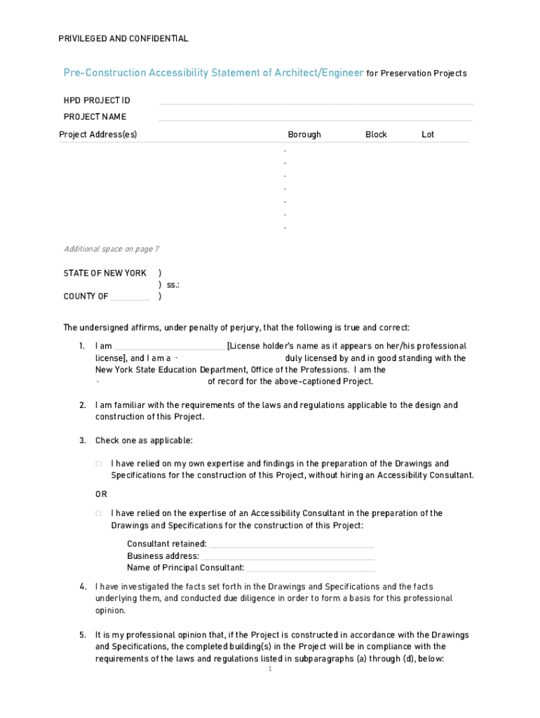 PRIVILEGED AND CONFIDENTIALPreConstruction Accessibility Statement of Architect/Engineer for Preservation Projects HPD PROJECT ID___PROJECT NAME___Project Address(BS)BoroughBlockLotAdditional space