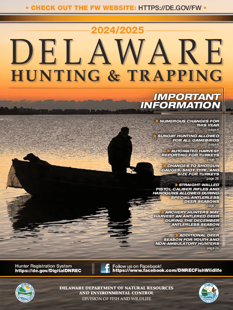 CHECK OUT THE FW WEBSITE: HTTPS://DE.GOV/FW 2024/2025D E L AWA R E HU N T ING & T R MAPPING IMPORTANT INFORMATION NUMEROUS CHANGES FOR THIS YEAR page 4 SUNDAY HUNTING ALLOWED FOR ALL WATERBIRDS page
