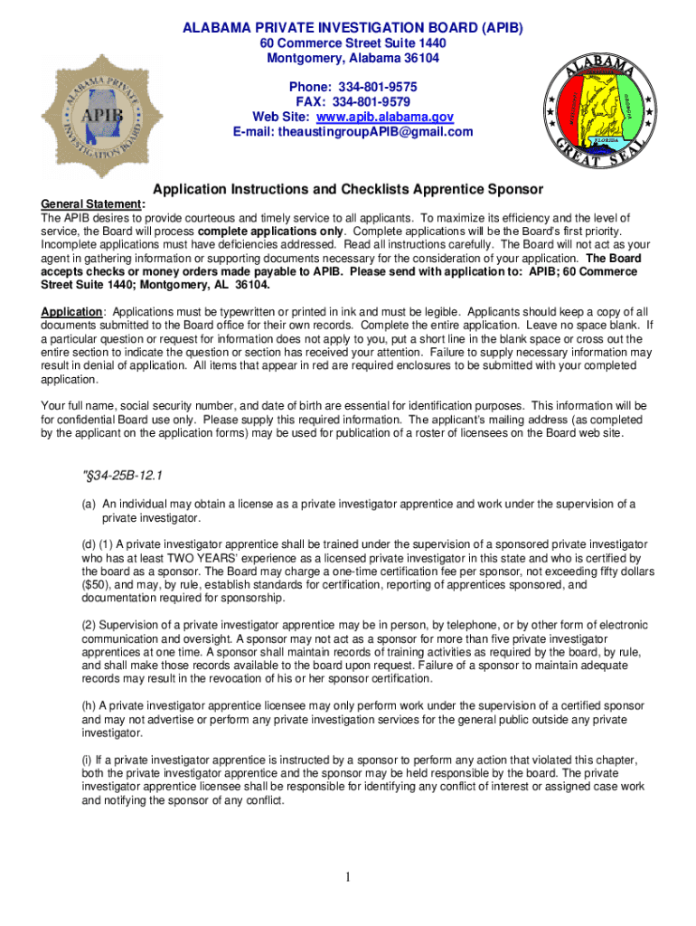 ALABAMA PRIVATE INVESTIGATION BOARD (APB) 60 Commerce Street Suite 1440 Montgomery, Alabama 36104 Phone: 3348019575 FAX: 3348019579 Website: www.apib.alabama.gov Email: theaustingroupAPIB@gmail.comApplication