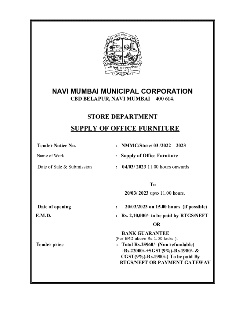 Tender Notice No.: MMC/Store/ 03 /2022 2023Name of Work: Supply of Office FurnitureDate