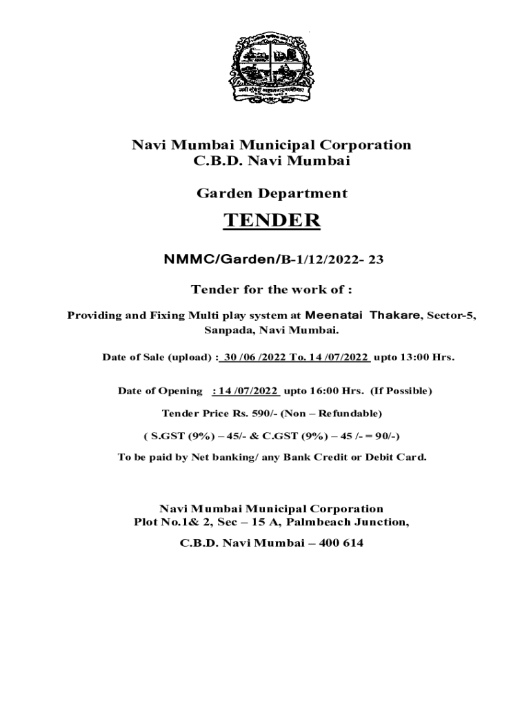 Navi Mumbai Municipal Corporation C.B.D. Navi Mumbai Garden DepartmentTENDER NMMC/Garden/B1/12/2022 23 Tender for the work of : Providing and Fixing Multi play system at Meenatai Thakare, Sector5,