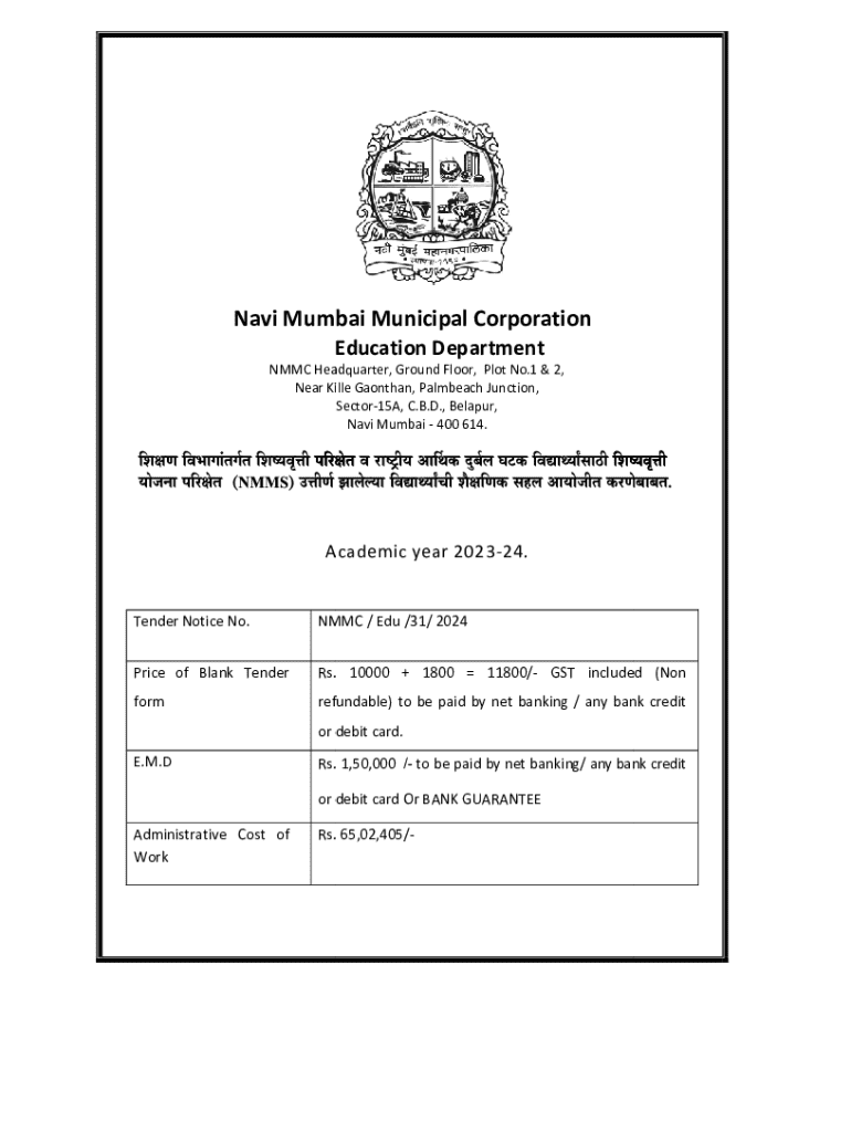 Navi Mumbai Municipal Corporation Education DepartmentNMMC Headquarter, First Floor, Plot No.1 & 2, Near Killed Jonathan, Palm beach Junction, Sector15A, C.B.D., Belarus, Navi Mumbai 400 614. Academic