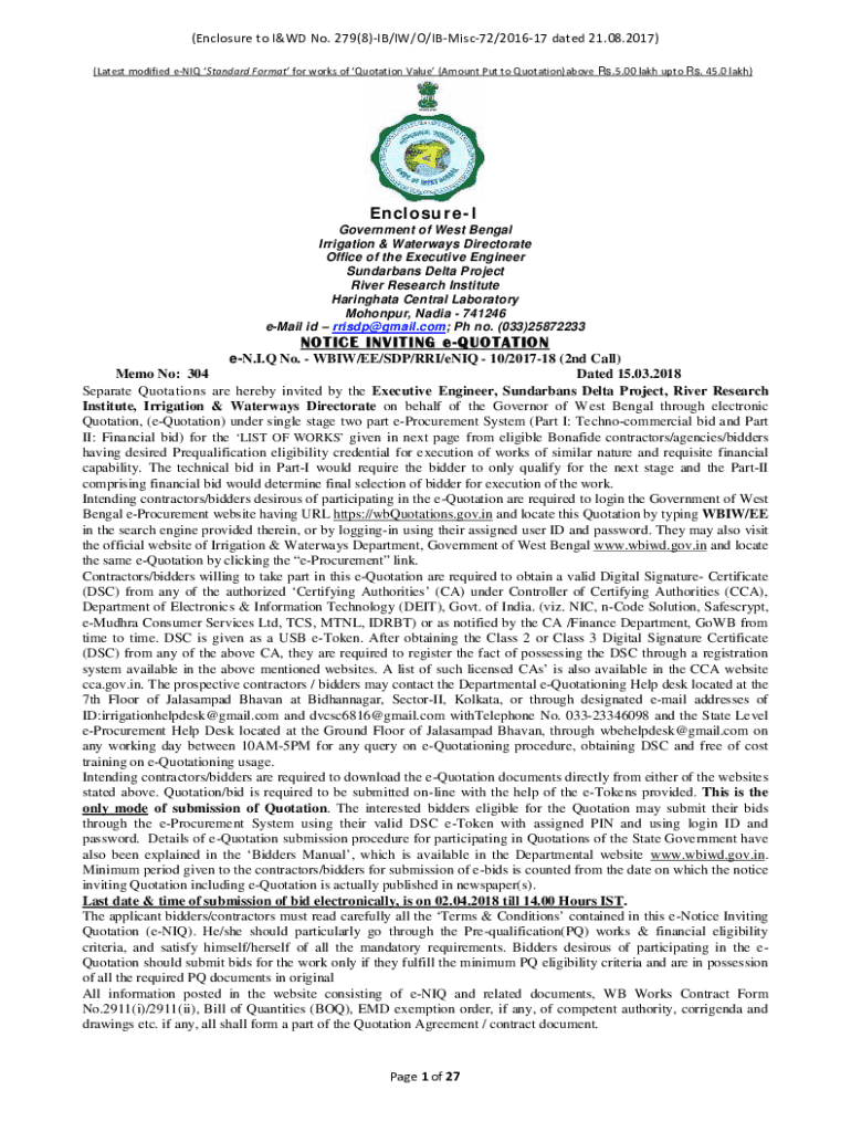(Enclosure to I&WD No. 279(8)IB/IW/O/IBMisc72/201617 dated 21.08.2017) (Latest modified eNIQ Standard Format for works of Quotation Value (Amount Put to Quotation)above Rs.5.00 lakh upto Rs. 45.0