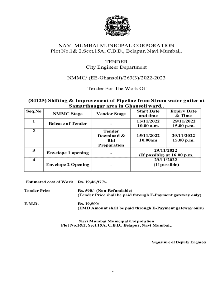 NAVI MUMBAI MUNICIPAL CORPORATION Plot No.1& 2,Sect.15A, C.B.D., Belapur, Navi Mumbai,. TENDER City Engineer Department NMMC/ (EEGhansoli)/263(3)/20222023 Tender For The Work Of (84125) Shifting &